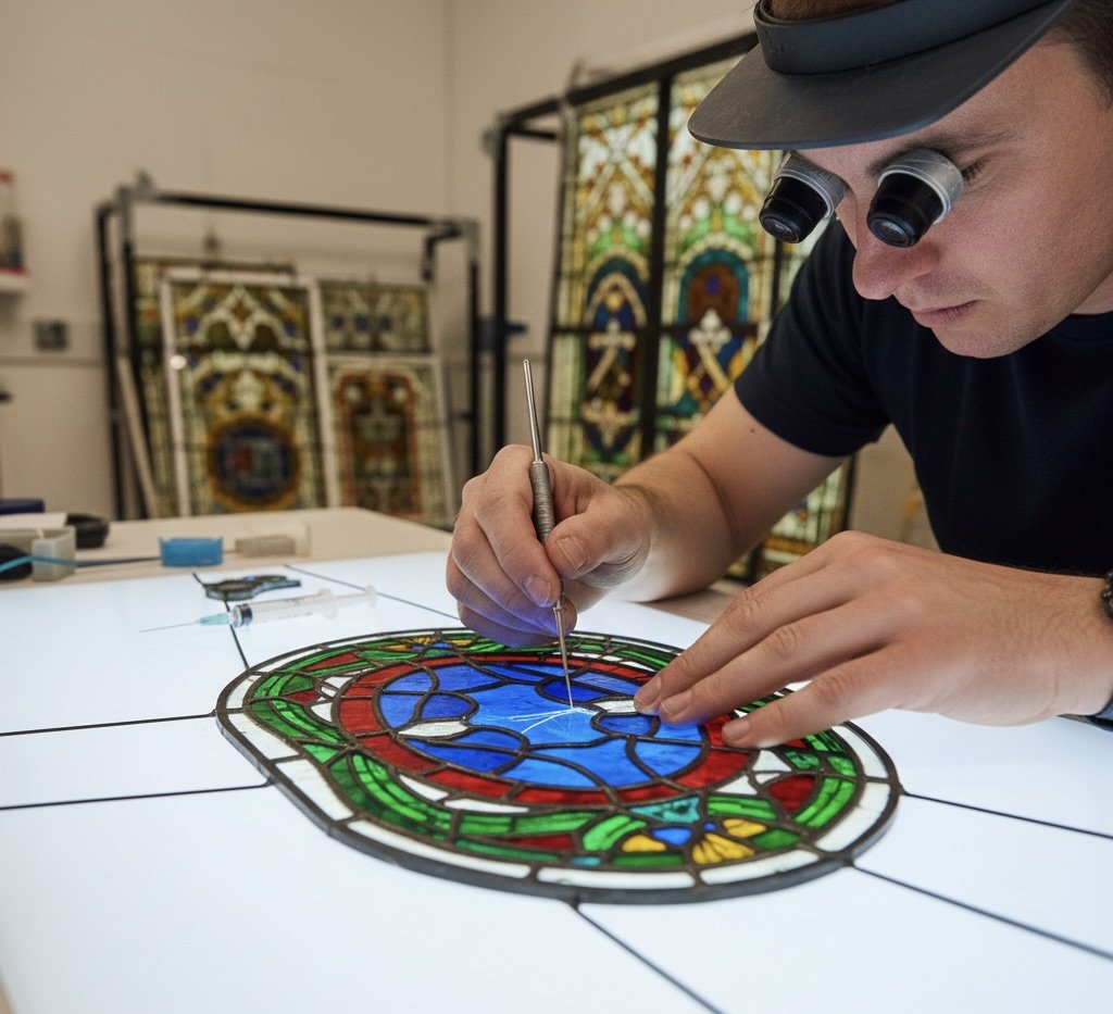The conservation of the Bolton windows is a critical requirement of the "Alchemical Nigredo" phase. Decades of exposure have led to the "spider-webbing" of lead cames and the fading of colors. The restoration protocol involves dismantling the panels for studio conservation, where individual segments are cleaned and edge-glued with restoration epoxies. To ensure their longevity, a new hurricane-grade clear protective glazing system will be installed on the exterior, utilizing a ventilation gap to prevent moisture buildup and the yellowing of the glass.