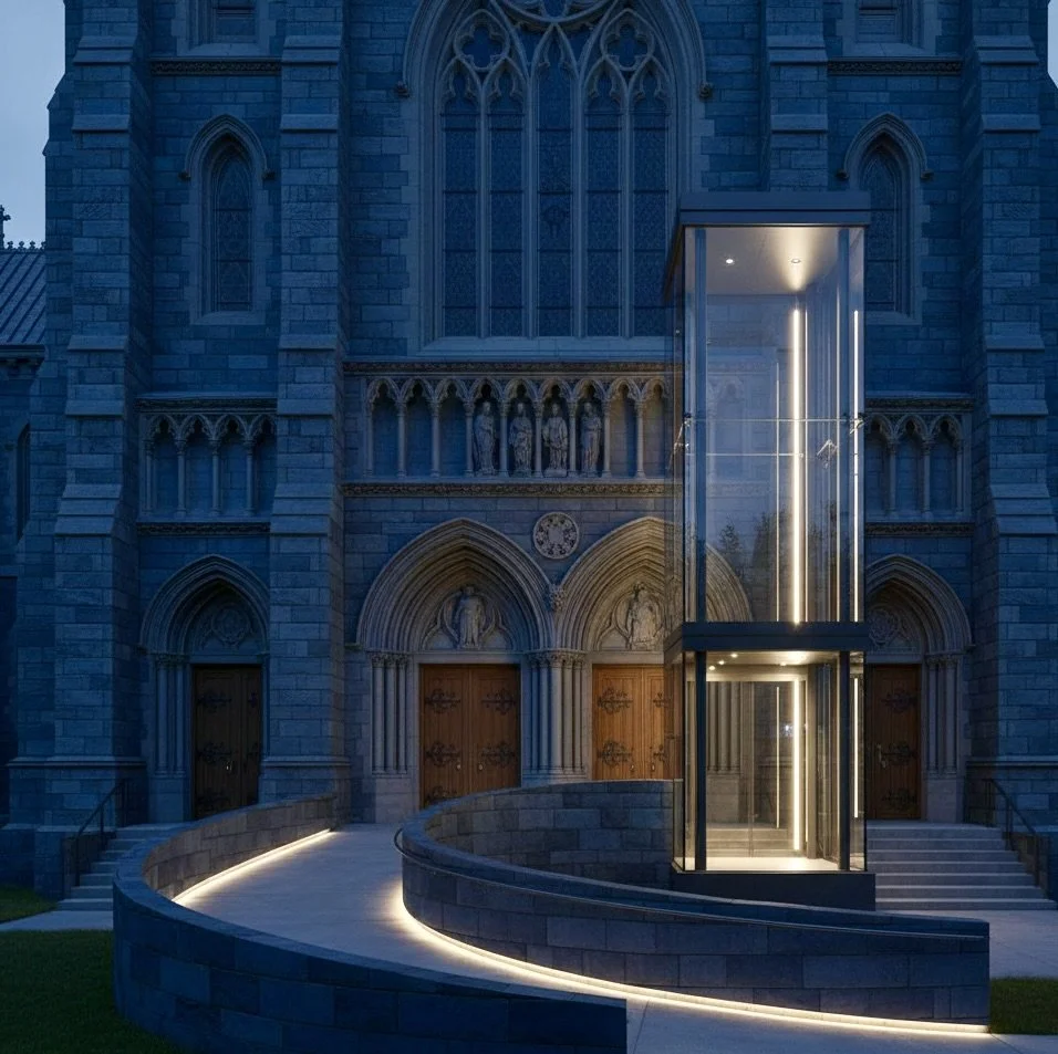 Traditional architectural interventions for accessibility, such as clinical metal ramps, often create a visual barrier that undermines the "Intended Entry Experience" of a Gothic cathedral. The Sage architect instead proposes a permanent, stone-clad ramp integrated into the side entrance, utilizing the same blue limestone as the original 1860 facade. This intervention fulfills the "Maximum Extent Feasible" standard of the ADA while preserving the visual symmetry and historical integrity of Patrick Keely’s design.